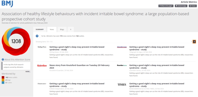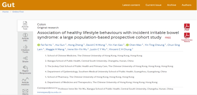 2月20日,国际胃肠病和肝脏病学领域知名期刊Gut(IF:24.5,中科院1区TOP)在线以Original Research发表了yl7703永利官网流行病与卫生统计学系吴心音教授团队的研究成果 “Association of healthy lifestyle behaviours with incident irritable bowel syndrome: a large population-based prospective cohort study”。已有包括美国有线电视新闻网(CNN)、英国独立报(The Independent)、卫报(The Guardian)在内的162家新闻媒体报道了该研究。该研究工作由中南大学和香港中文大学两支研究团队共同完成。吴心音教授为该文唯一通讯作者,中南大学为唯一通讯单位。